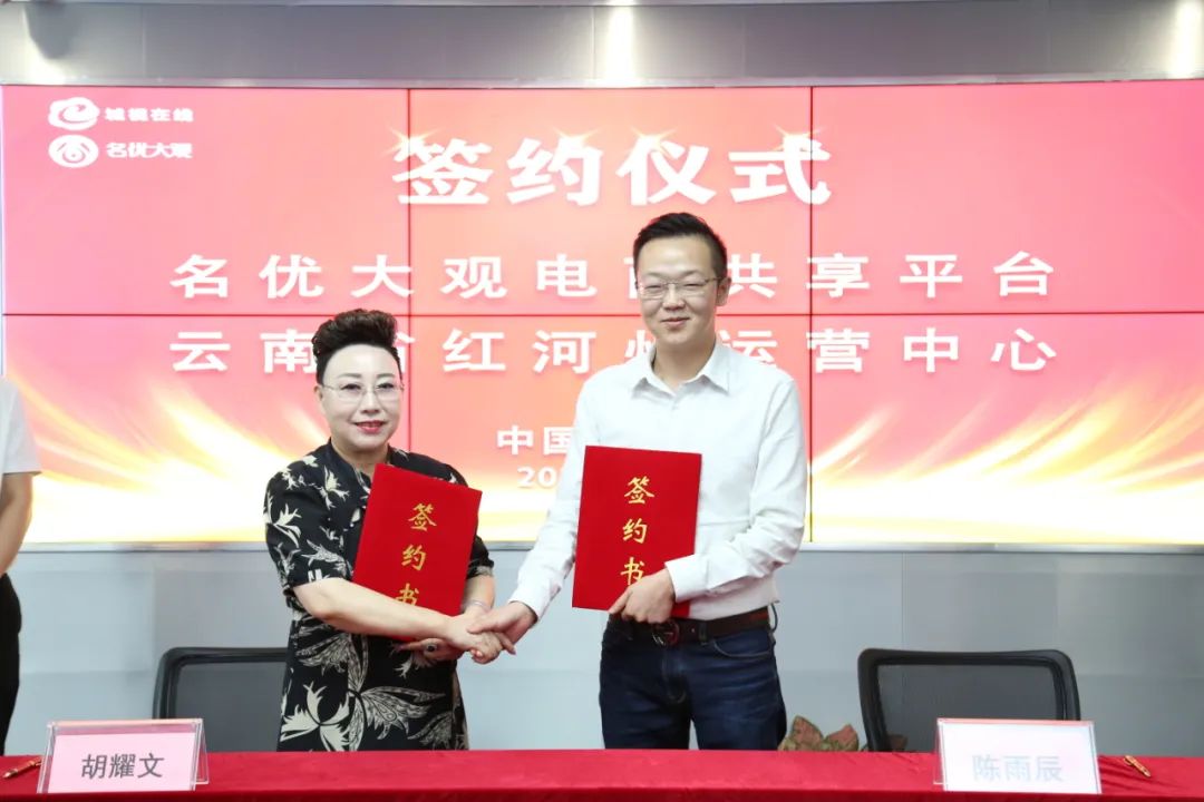 城视在线董事长胡耀文(左)与云南省昆明市运营中心、红河州运营中心陈雨辰代表(右)