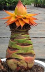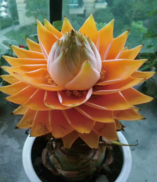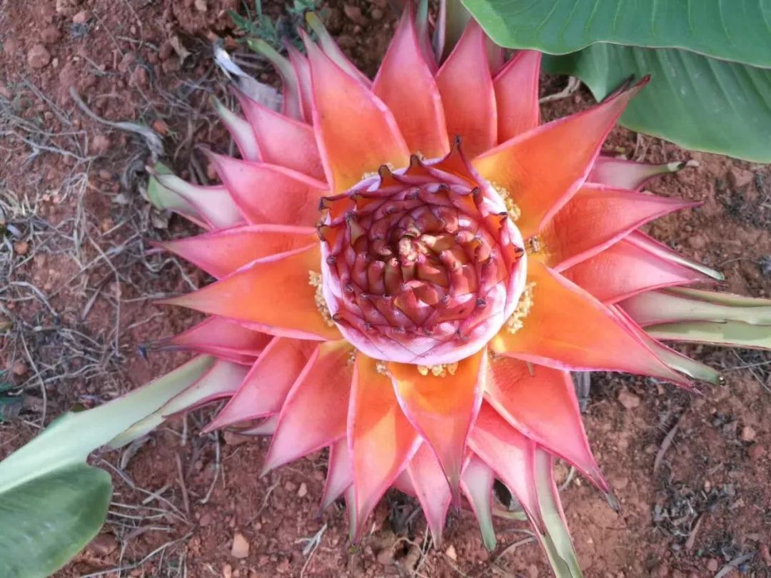 “佛乐金莲”:多年生大型草本,株形紧凑,株高(129.4±8.9)cm;叶片卵圆形,叶形指数1.77~1.94,叶片羽状侧脉凸出不明显,中脉腹面基部浅紫红色,上部绿色,背面浅紫红色;苞片卵状三角形,腹面黄橙色,背面橙红色。种植3-4年开花,群体花期3月-10月,单株花期6-8个月,最长可达2年。繁殖方式为组织培养。